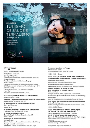 O Turismo de Saúde e Bem-estar como alavanca do desenvolvimento regional, o desenvolvimento do turismo médico em Portugal e perspetivas para os desafios médicos são alguns dos muitos temas em debate no Seminário "Turismo de Saúde e Termalismo", que acolherá em Chaves mais de uma dezena de especialistas na área. A iniciativa é organizada pela Escola Superior de Enfermagem Dr. José Timóteo Montalvão Machado, em parceria com a Cruz Vermelha Portuguesa, Município de Chaves e Instituto Politécnico de Bragança e decorrerá no Museu de Arte Contemporânea Nadir Afonso, no dia 9 de março. O Presidente Nacional da Cruz Vermelha Portuguesa, Francisco George, o Presidente da Associação das Termas de Portugal, Victor Leal e o Presidente da Sociedade Portuguesa de Hidrologia Médica, Pedro Cantista, são algumas das presenças a destacar. Este encontro é direcionado para profissionais e estudantes, tendo como objetivo a partilha multi profissional de conhecimentos e experiências transversais ao setor termal, nas vertentes terapêutica e de bem-estar. O Alto Tâmega possui uma grande concentração termal, com paisagens naturais deslumbrantes, que serão o ponto de partida do seminário. Os interessados poderão inscrever-se em www.esechaves.pt